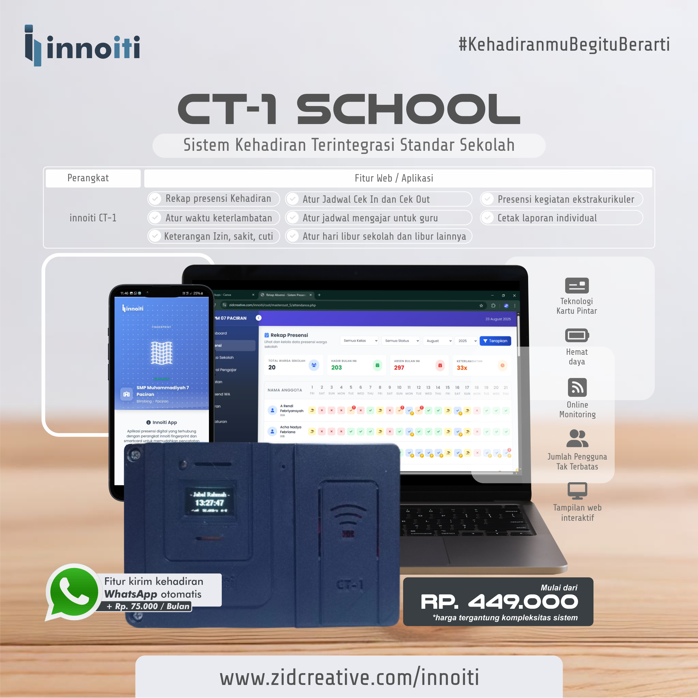 Perangkat presensi kehadiran dengan teknologi Kartu Pintar yang terintegrasi dengan website dan aplikasi secara realtime didesain khusus untuk kebutuhan sekolah