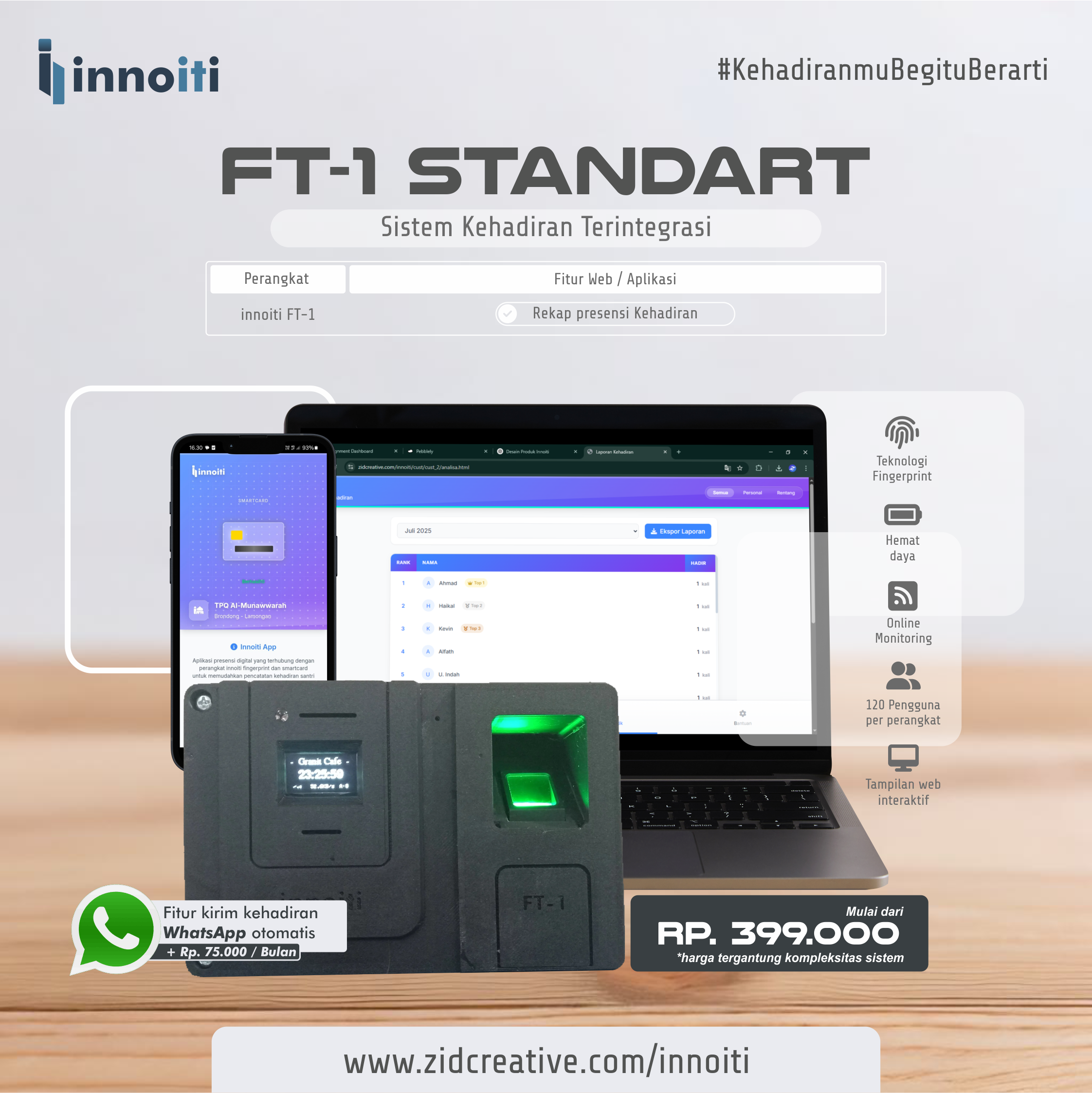 Perangkat presensi kehadiran dengan teknologi Sidik Jari yang terintegrasi dengan website dan aplikasi secara realtime didesain khusus untuk kebutuhan sekolah