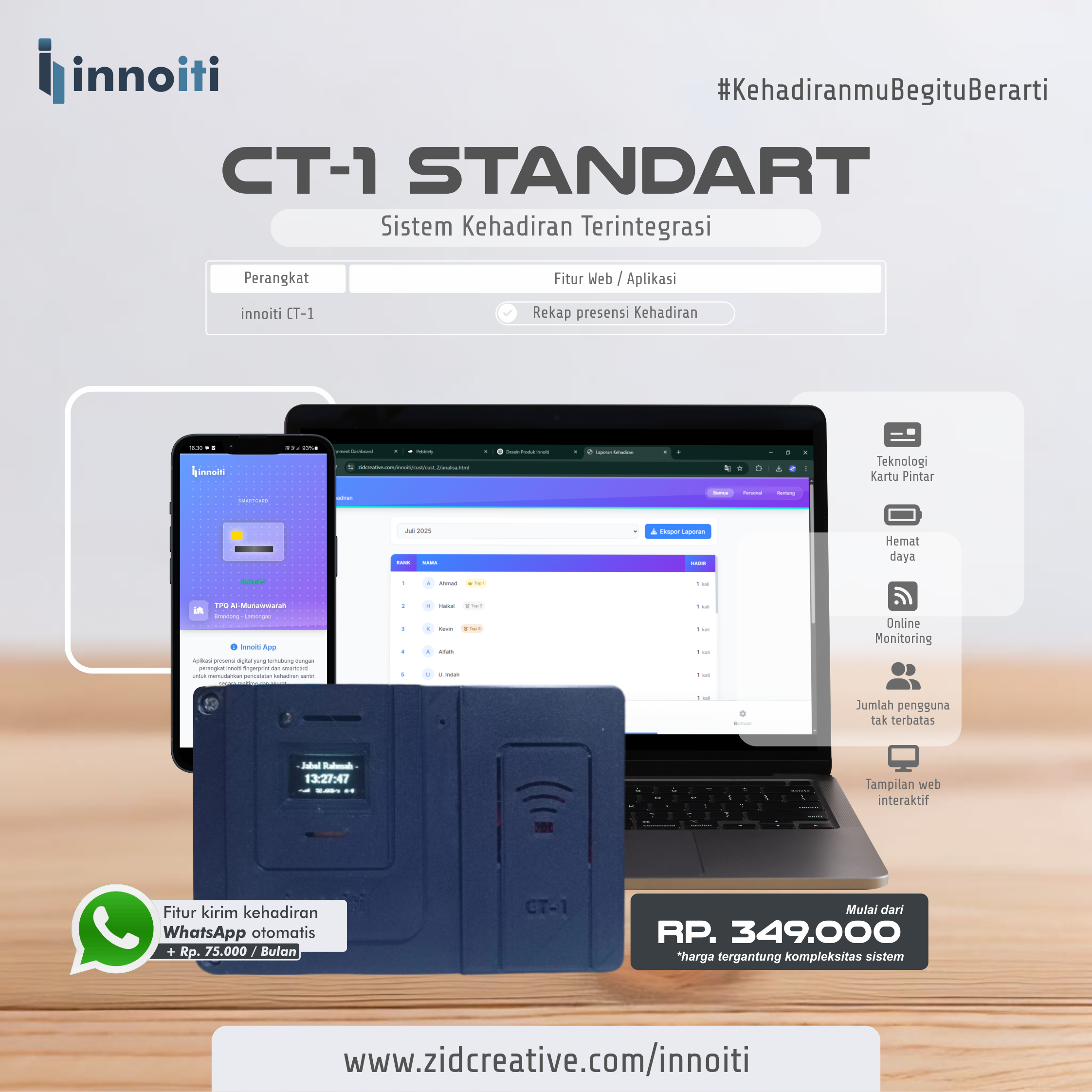 Perangkat presensi kehadiran dengan teknologi Kartu Pintar yang terintegrasi dengan website dan aplikasi secara realtime.