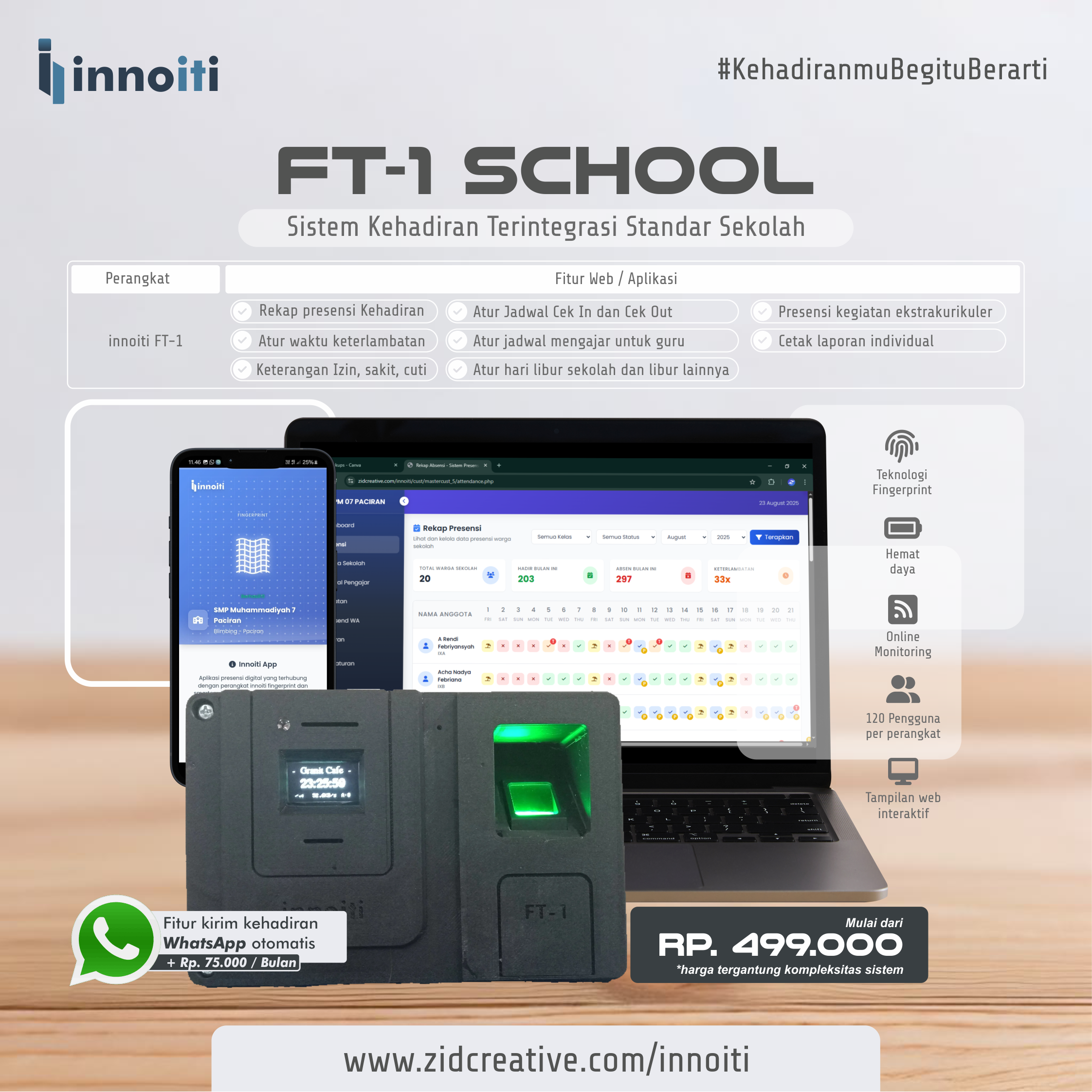 Perangkat presensi kehadiran dengan teknologi Sidik Jari yang terintegrasi dengan website dan aplikasi secara realtime didesain khusus untuk kebutuhan sekolah